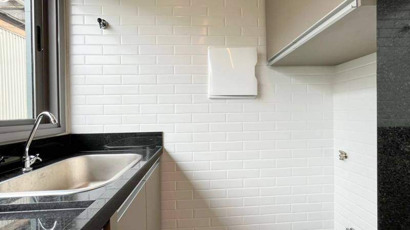 Cozinha funcional com bancada em granito e piso em porcelanato