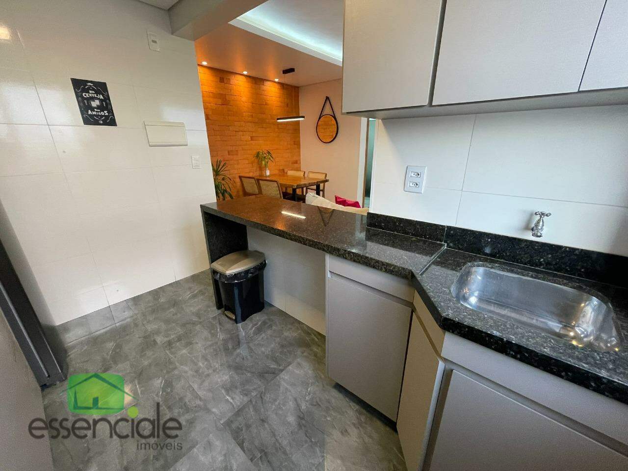 Sala para 2 ambientes com varanda integrada com cortina de vidro e bancada em granito e armário.