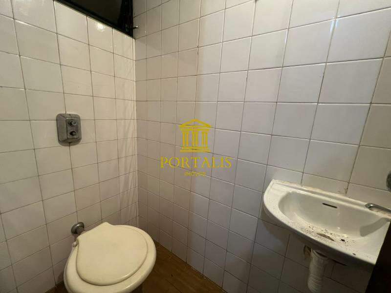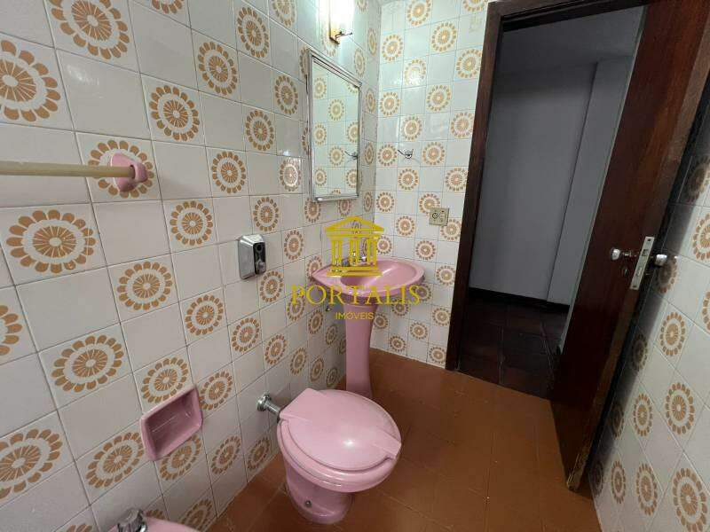 Banheiro social amplo com pia em coluna de apoio, piso em cerâmica e box em blindex